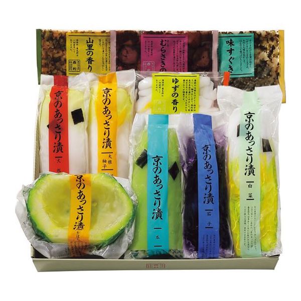 商品内容:●京のあっさり漬(大根1/4割・かぼちゃ半割・茄子1個・瓜1/4割・白菜223g・大根柚子1/4割)、赤しそむらさきの58g、味すぐき49g、山里の香り43g、ゆずの香り58g●原産国:日本●加工地:日本●【賞味期間】製造日より(約)冷蔵7日間●アレルギー【小麦】●箱サイズ(約)29×26.8×5.2cm●箱重量(約)1.6kg●梱包詳細:商品⇒化粧箱⇒短冊熨斗⇒包装⇒送り状●包装有無:完全包装●二重包装:可●のし下対応:可●のし形態:中元歳暮(短冊)、蝶結び(短冊)、結び切り(巻のし)、仏事(巻のし)●梱包状態:化粧箱入●宅配:冷蔵便 【メーカー直送】 【お申込日8/20まで】 ※本品はメーカー直送品の為、 ・代引き・後払い不可 ・のし紙・包装紙の種類はメーカー指定のもの。