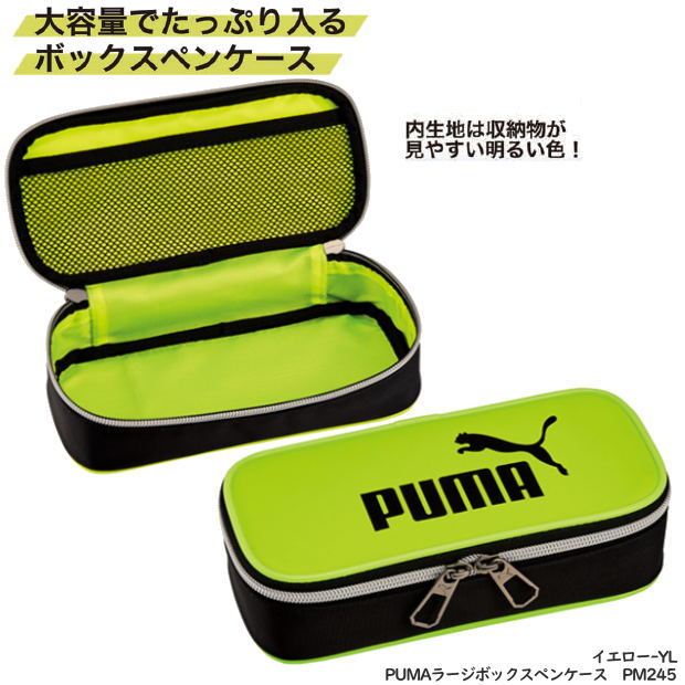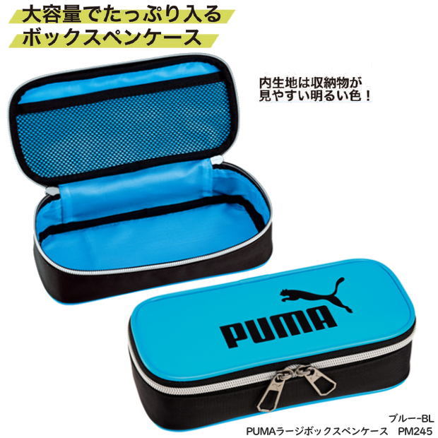 小学生・中学生男子に人気の大容量のワンボックス型ペンケース 本体には、マット調の合皮生地とナイロン生地を使用 ・フタ内側にメッシュポケット付き ・メタリックファスナー ・オリジナルデザインの引き手付 商品名 ラージボックスペンケース プーマ PUMA 品番 PM245BK ブラック/ PM245YE イエロー/ PM245BL ブルー サイズ 横95×縦205×厚さ55mm 重さ:約)80g 仕様 1室タイプペンケース 中身が見やすいメッシュポケット付き 材質 合成皮革(PU)、ナイロン、ポリエステル メーカー クツワ株式会社 ※他のモール及び店頭売りと在庫を併用しておりますのでご注文後でも在庫切れの場合がございますのであらかじめご了承下さい。